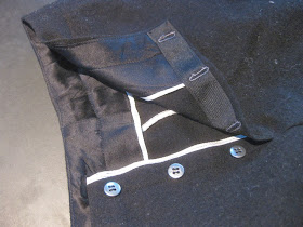 For the closure I just used a little longer seam allowance on one of the side seams and created a sort of fly detail by lapping the pieces together; pretty much just like a regular stitched seam (though not all the way up) with both allowances pressed towards the front. This was set up so that three buttons would later be able to close the 'fly'.